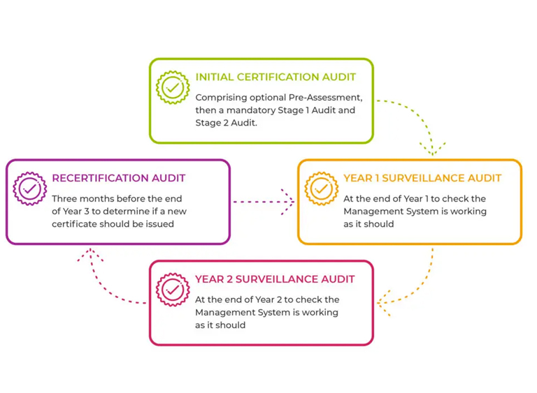 Mendapatkan dan mempertahankan sertifikasi untuk Sistem Manajemen Lingkungan ISO 14001 Anda bukanlah peristiwa tunggal. Ini adalah serangkaian audit dan ulasan yang terhubung dan berkelanjutan untuk memastikan bahwa organisasi dan Sistem Manajemen Anda sesuai dengan standar ISO relevan yang ingin Anda sertifikasi.